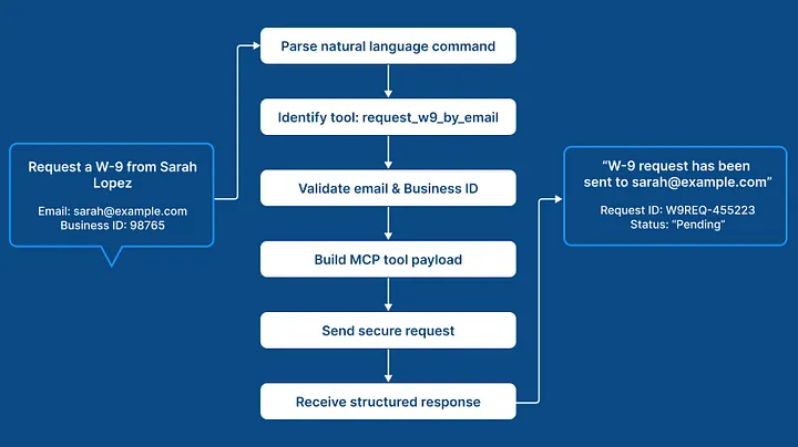 When the AI model receives this command, it doesn’t fabricate a response. Instead, the MCP runtime breaks your instruction down into a set of machine-readable intents. It identifies that the action corresponds to the request_w9_by_email tool, extracts and validates parameters (recipient name, email, and business ID), and converts those parameters into a valid MCP tool invocation.